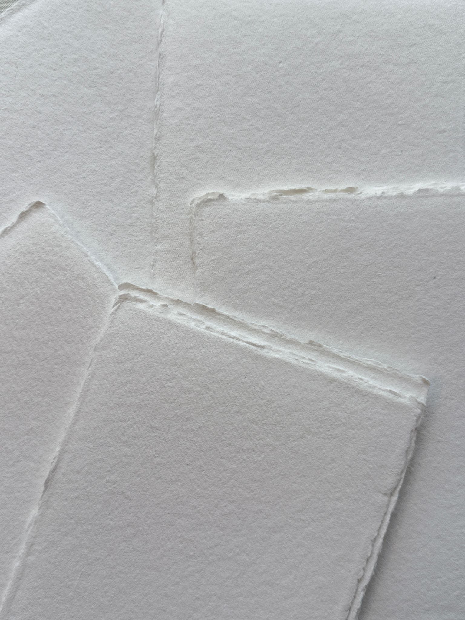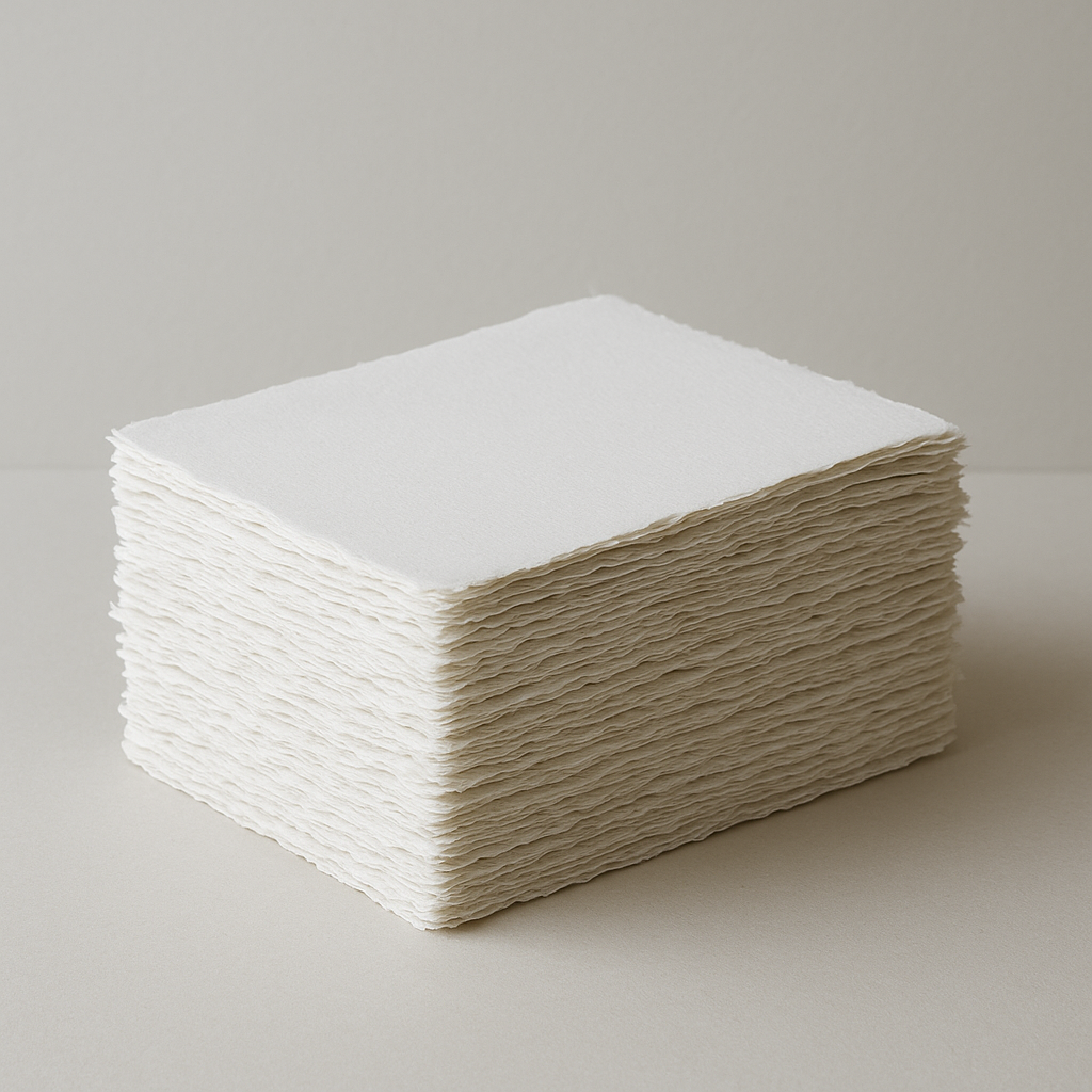 Papel hecho a mano con fibras naturales, bordes únicos y un acabado elegante. Ideal para invitaciones, cartas y proyectos creativos que buscan autenticidad.