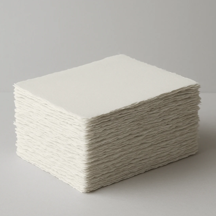 Descubre nuestro papel hecho a mano en algodón 100 %, con un gramaje de 300 gr y un elegante tono Marfil. Cada hoja presenta un delicado borde deckle natural, perfecto para diseños de papelería, acuarela, caligrafía, impresión digital o letterpress.