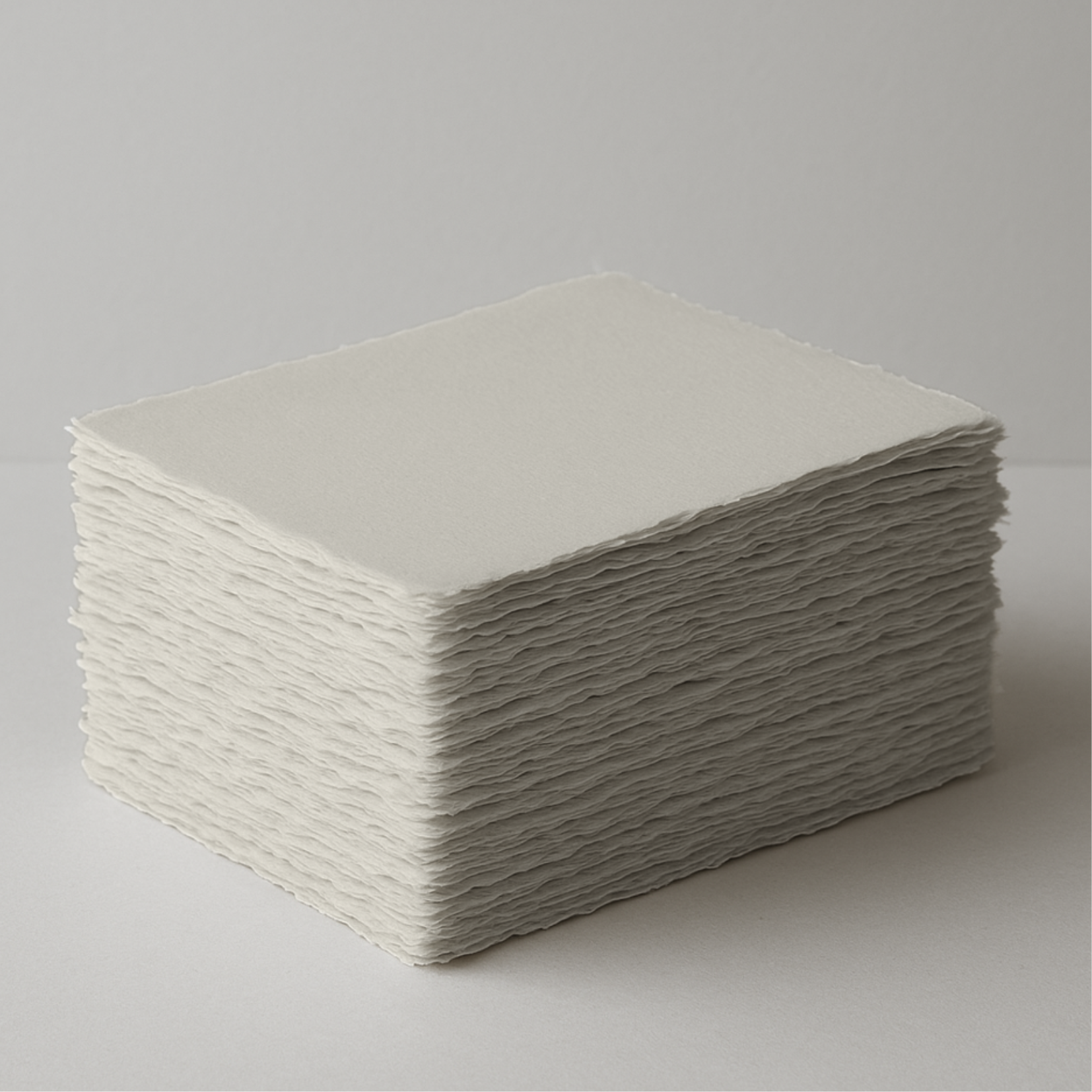Descubre nuestro papel hecho a mano en algodón 100 %, con un gramaje de 200 gr y un elegante tono Arena. Cada hoja presenta un delicado borde deckle natural, perfecto para diseños de papelería, acuarela, caligrafía, impresión digital o letterpress.