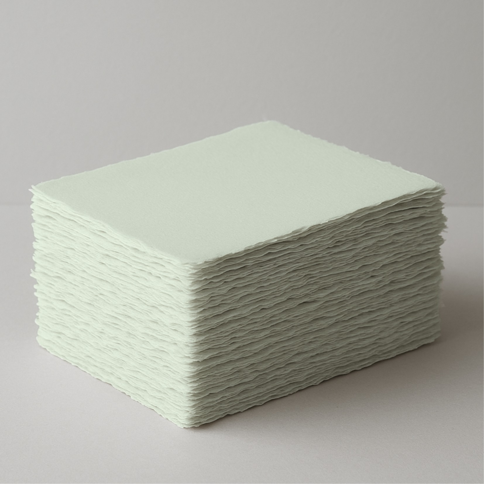 Descubre nuestro papel hecho a mano en algodón 100 %, con un gramaje de 300 gr y un elegante tono Verde. Cada hoja presenta un delicado borde deckle natural, perfecto para diseños de papelería, acuarela, caligrafía, impresión digital o letterpress.