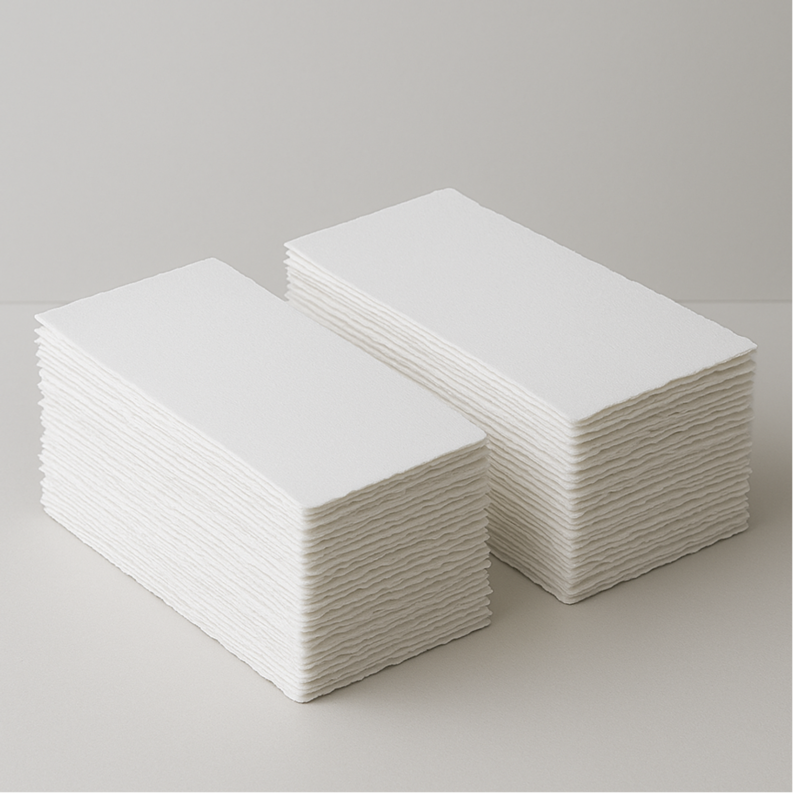 Descubre nuestro papel hecho a mano en algodón 100 %, con un gramaje de 200 gr y un elegante tono Blanco. Cada hoja presenta un delicado borde deckle natural, perfecto para diseños de papelería, acuarela, caligrafía, impresión digital o letterpress.